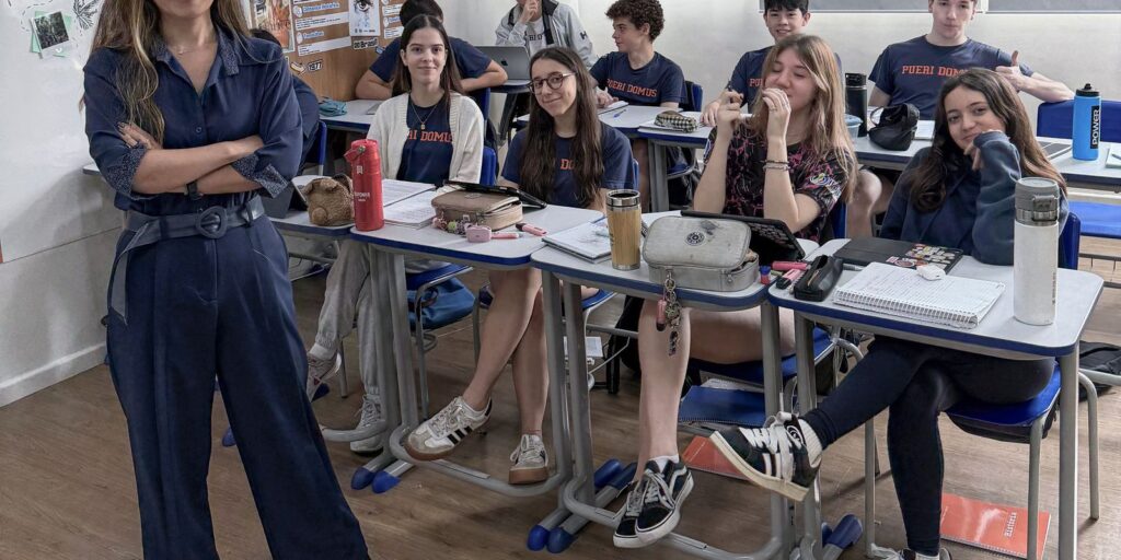 A professora Cintia Etsuko Yamashita, coordenadora pedagógica da Escola Bilíngue Pueri Domus, da Aclimação, em São Paulo, dá dicas aos estudantes – Foto Cintia Etsuko Yamashita/Arquivo pessoal